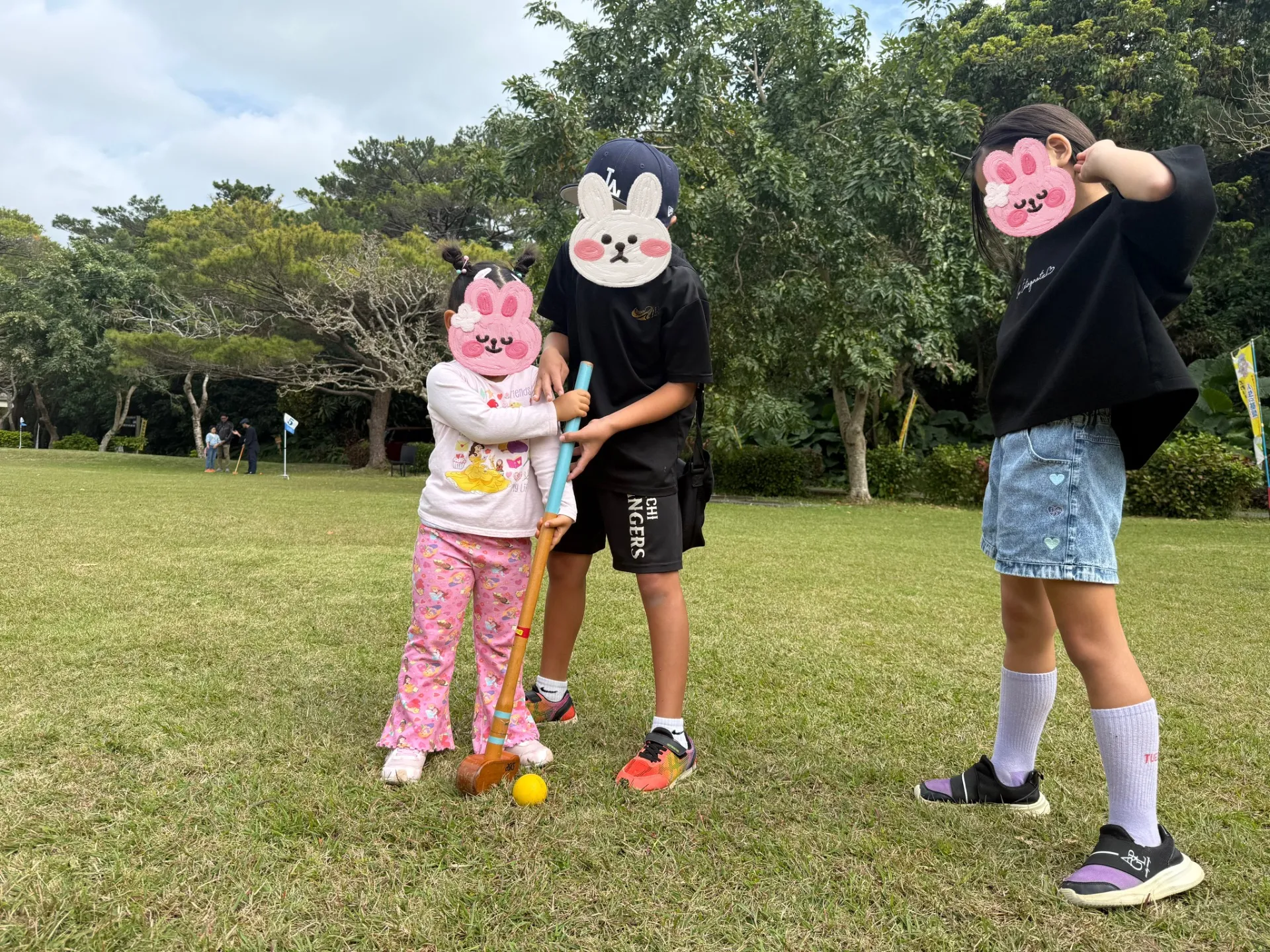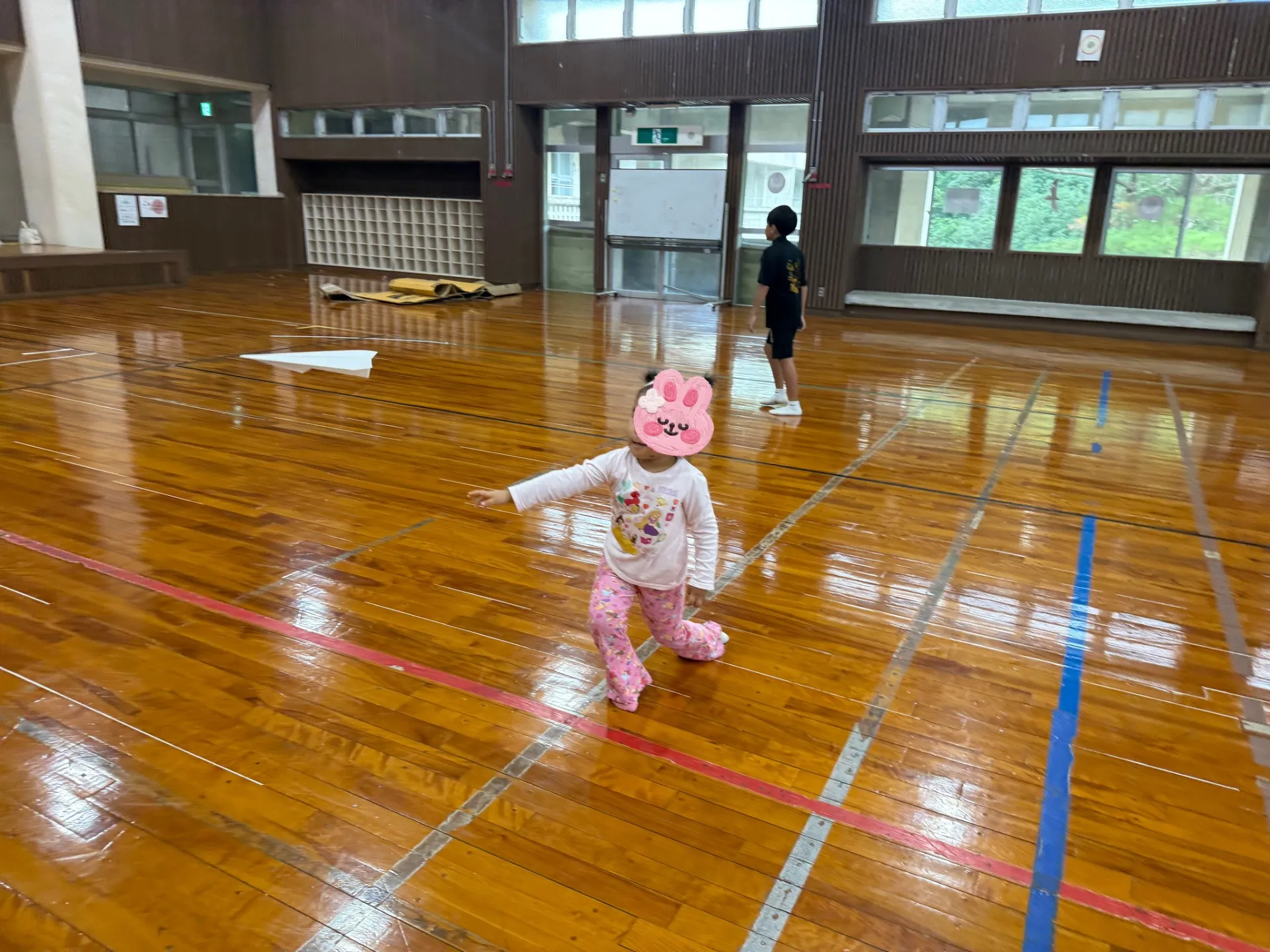 お預かり中のお子さまと一緒に、紙飛行機づくりやグラウンドゴルフ体験、輪投げなどを楽しみました。